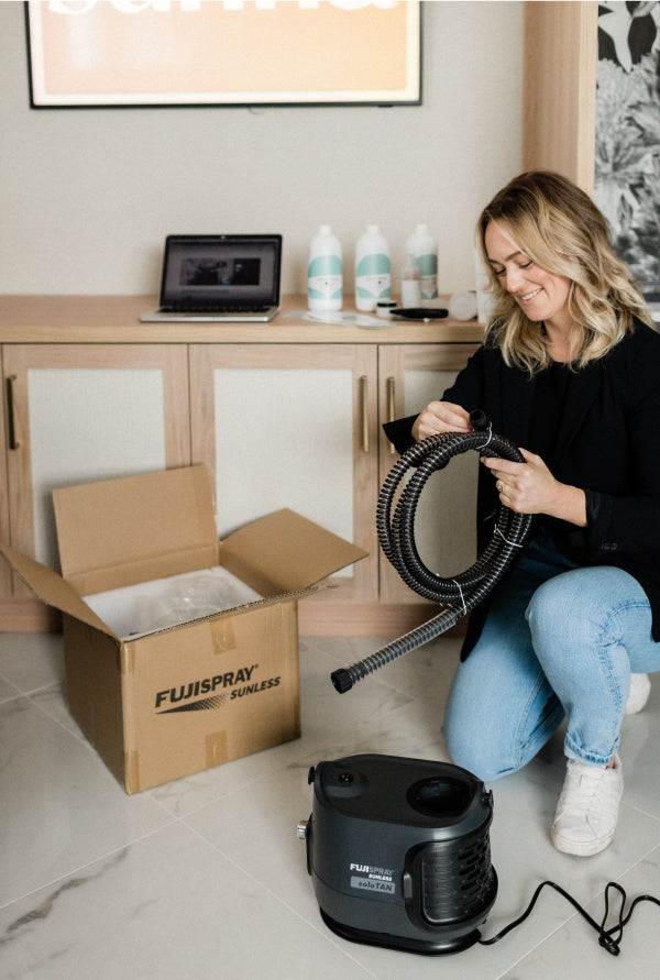 A:While spray tanning can have a bad wrap for being messy, staining & smelling up your space; you haven’t experienced the difference with SunnaTan! All natural ingredients and bronzers make clean up a breeze. All you need is warm water & mild soap. Because our formulation doesn’t have dyes, it doesn’t stain! And because our professional solutions are fragrance free (scented naturally with vanilla fruit water), after doing back to back clients, you won’t have to worry about lingering fragrance for your scent sensitive customers. We’ll also teach you how to reduce overspray with our tried and tested insider tips & tricks.