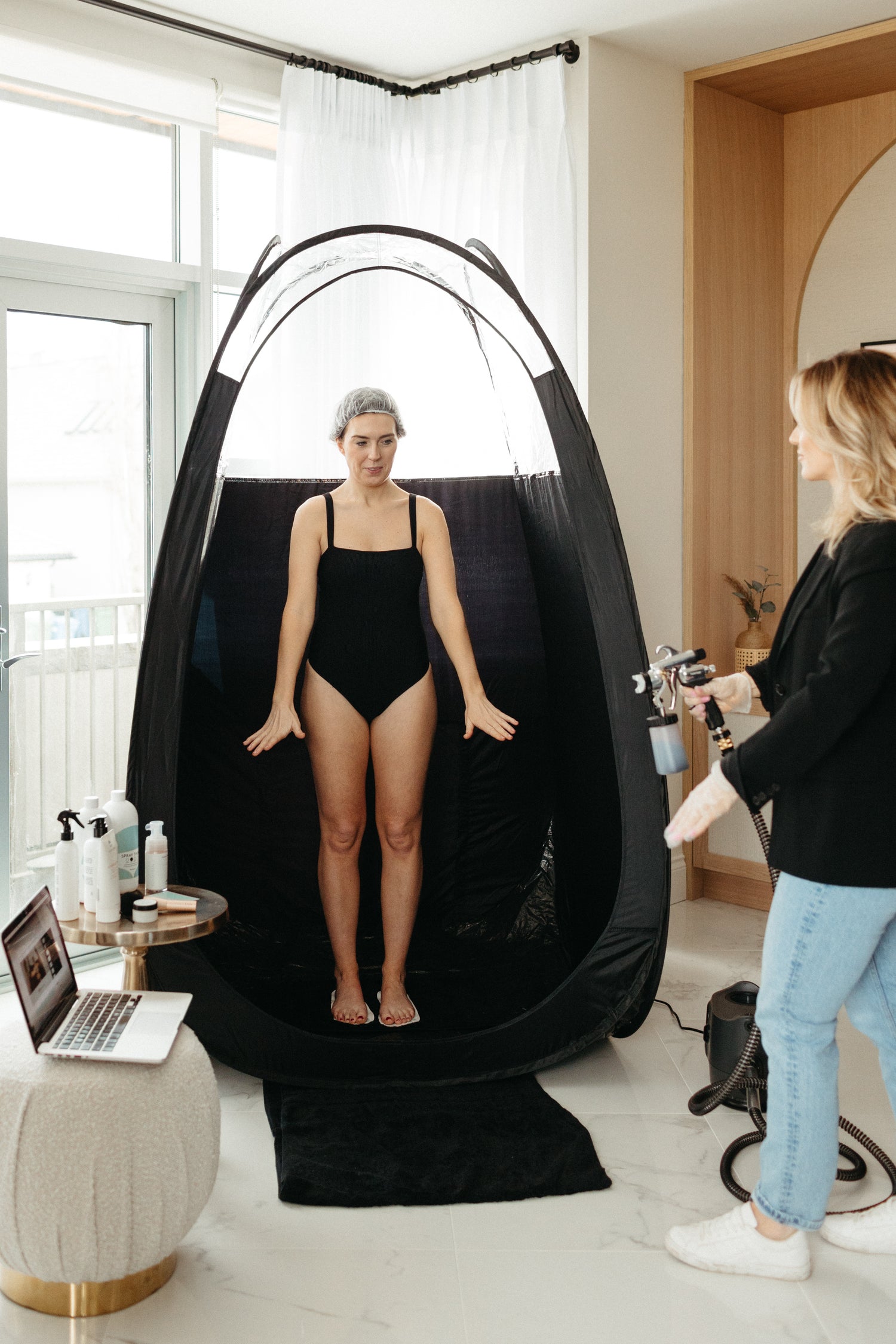 A:With the SunnaTan process & client experience that we teach you (this is what makes us different and makes your clients coming back for more!) there are a mix of products used, including our signature solution, natural & organic balms, luxury lotions, shimmery after tan powder & more! Our SunnaTan spray tan artists typically find it costs them on average $10 to do a tan. If you charge $50 per tan, you are profiting $40 in a 20–30-minute appointment.